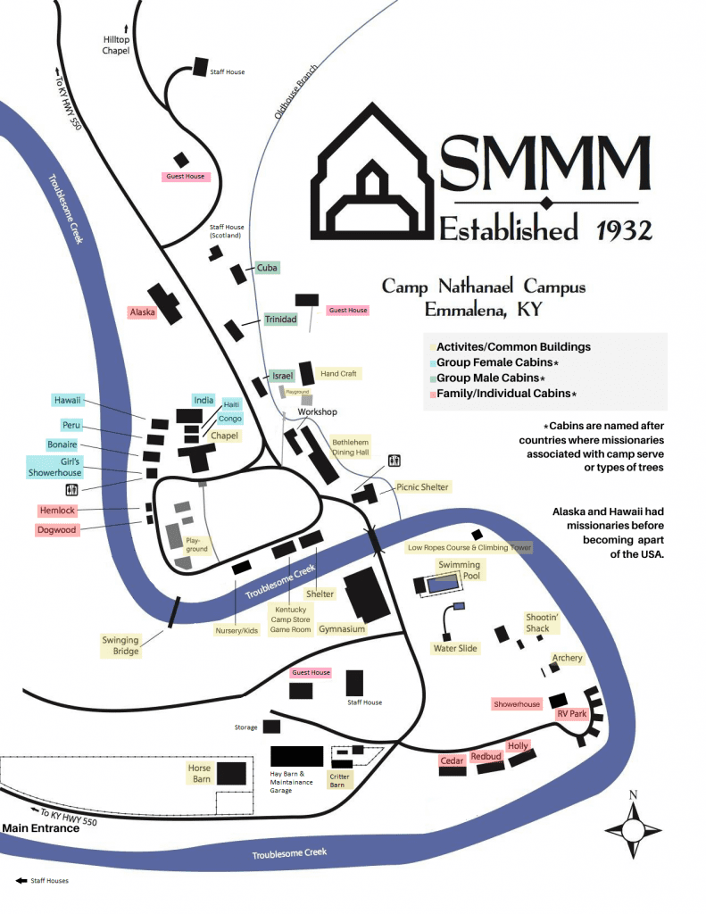 Camp is located in Knott County, Kentucky with 490 acres and 35+ buildings, including everything from cabins, a pool, a full gym, dining hall, rec hall, trails, and a chapel. There are 25 full-time missionaries working at camp and serving people in surrounding counties including Harlan, Knott, Knox, Leslie, Letcher, and Perry county.