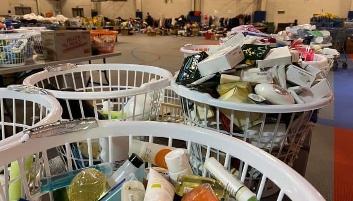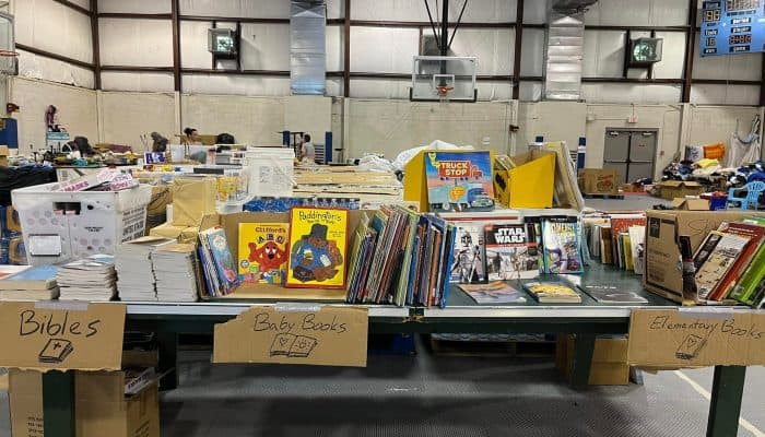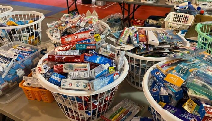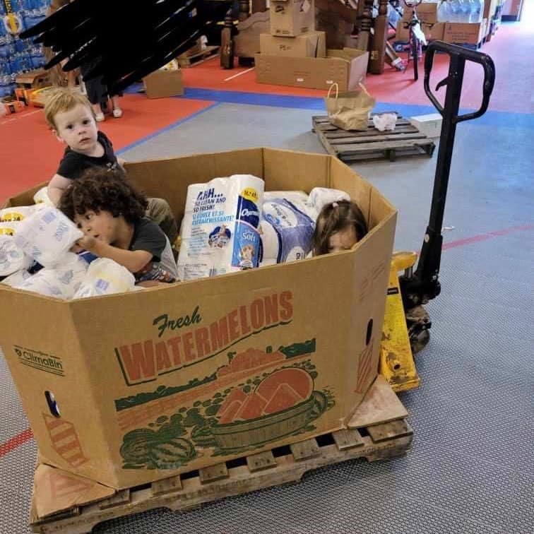 Tess has been helping out in the dining hall and in the Distribution Center, sorting and organizing the donations that come in. The Distribution Center is set up in sections so that people can come “shop” for anything they may need. Everything is being given away for free.